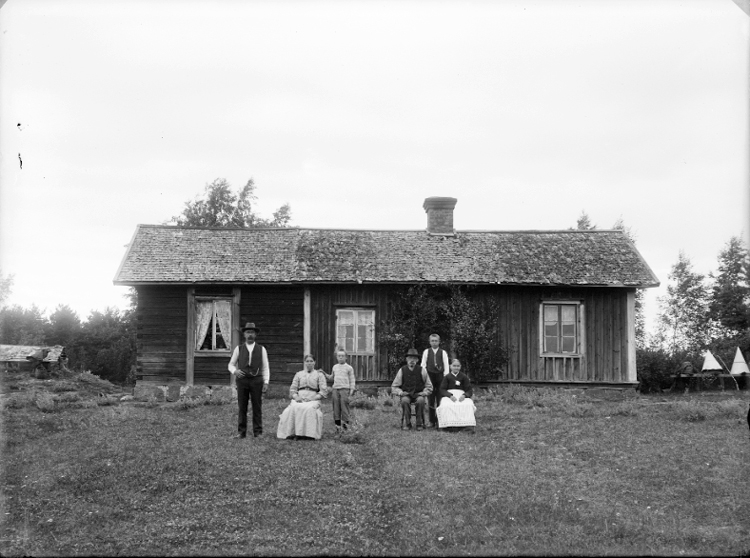 Två damer, två herrar och två barn framför låg och lång stuga.
