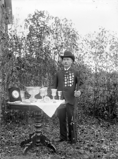 Medaljprydd herre med gevär, vid bord med pokaler.