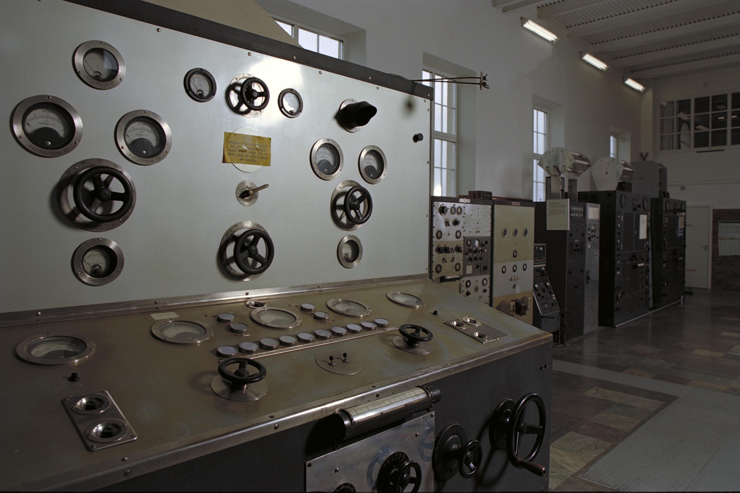 I förgrunden äldre 7 kW Marconi kortvågssändare. I bakgrunden, överst antenntransformator, nederst magnetisk förstärkare.