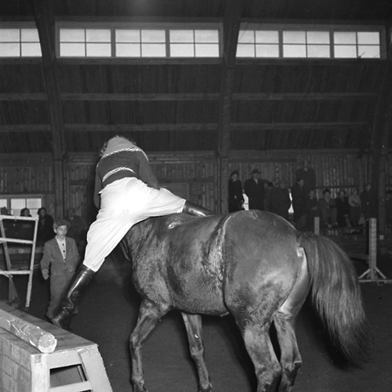 Titel: Ryttartävling i SKLS (Skaraborgs Läns Slakteriförening) uppvisningshall, Skara. December 1950.