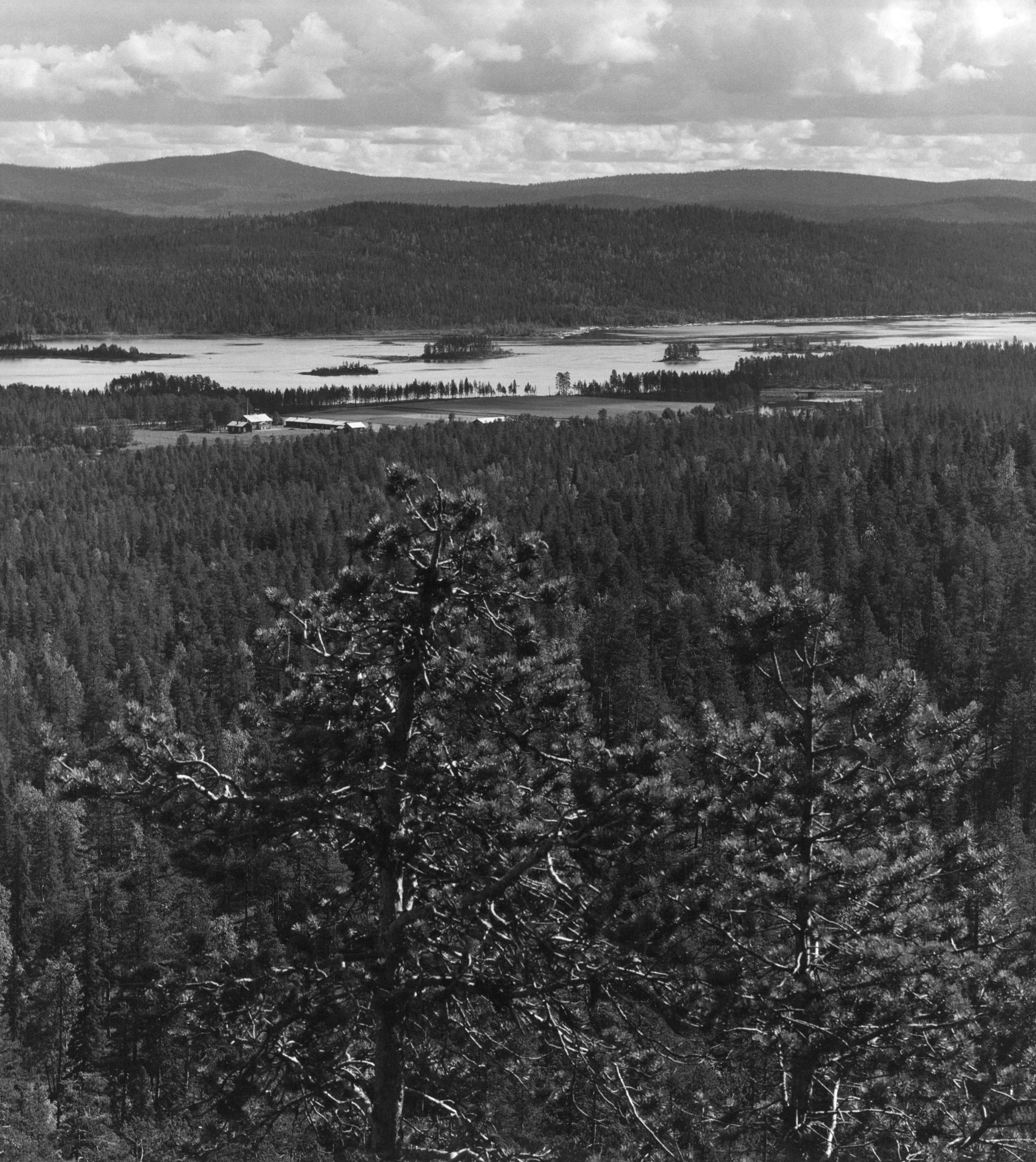 Vy från utsiktsberget vid Jokkmokk över Lilla Luleälv mot öster. Bilden troligen från början av 1960-talet.