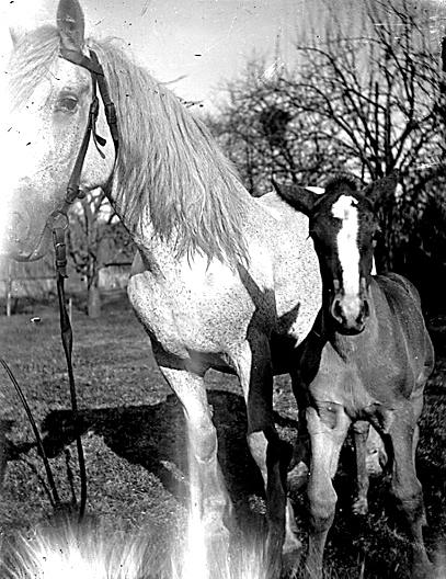 Häst med föl i Milsmaden c:a 1925.