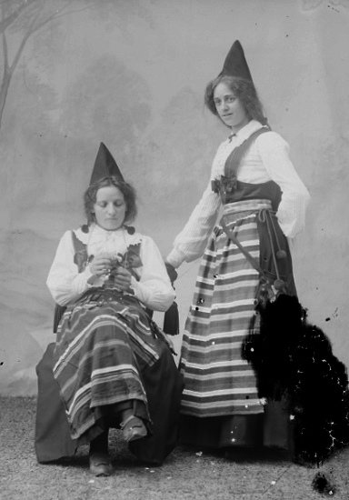 Två damer i folkdräkter, troligen Rättviksdräkten.