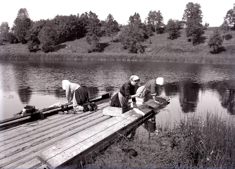 Tre kvinnor tvättar kläder vid bryggan 1920-1930.