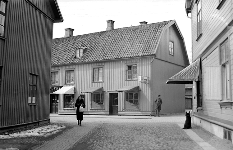 Titel: Marumsgatan med Ida Levins affär, Skara. Från Olins gränd, 1938.
