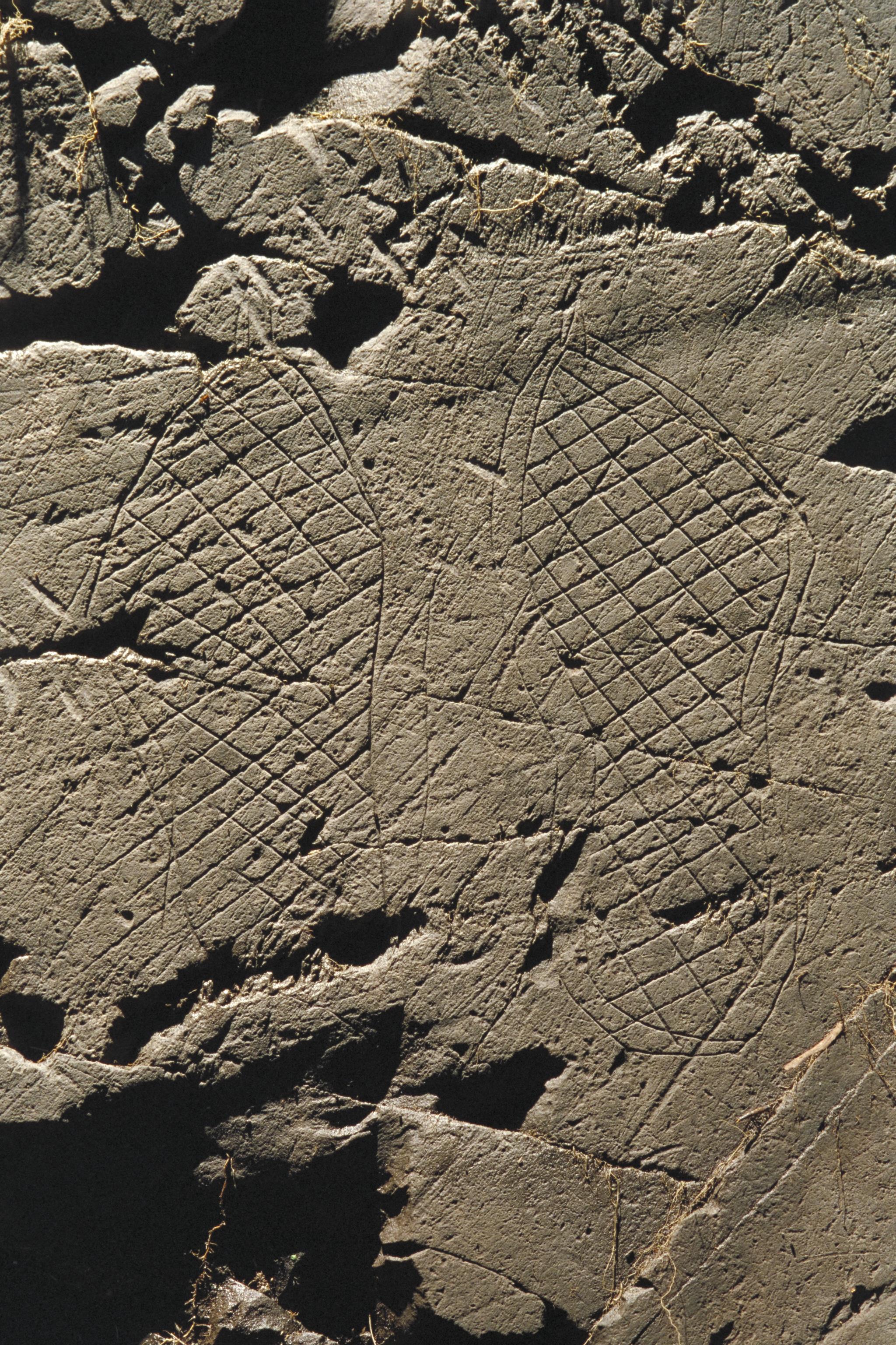 RAÄ-nummer Tisselskog 7:3. Skurna fotfigurer med rutmönster, troligen moderna ristningar.