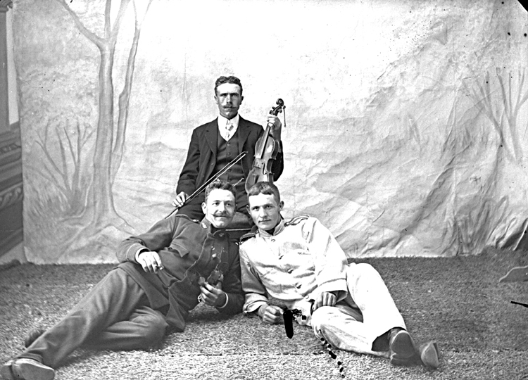 Tre herrar, en med fiol, två liggande på golvet.