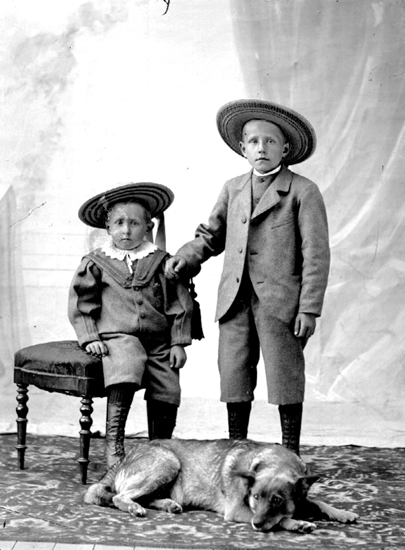 Ateljé. Två pojkar i storbrättade hattar och en hund.