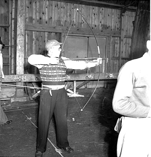 Titel: Skara. Bågskytte, uppvisning i SKLS Hallen 11/3 1951.