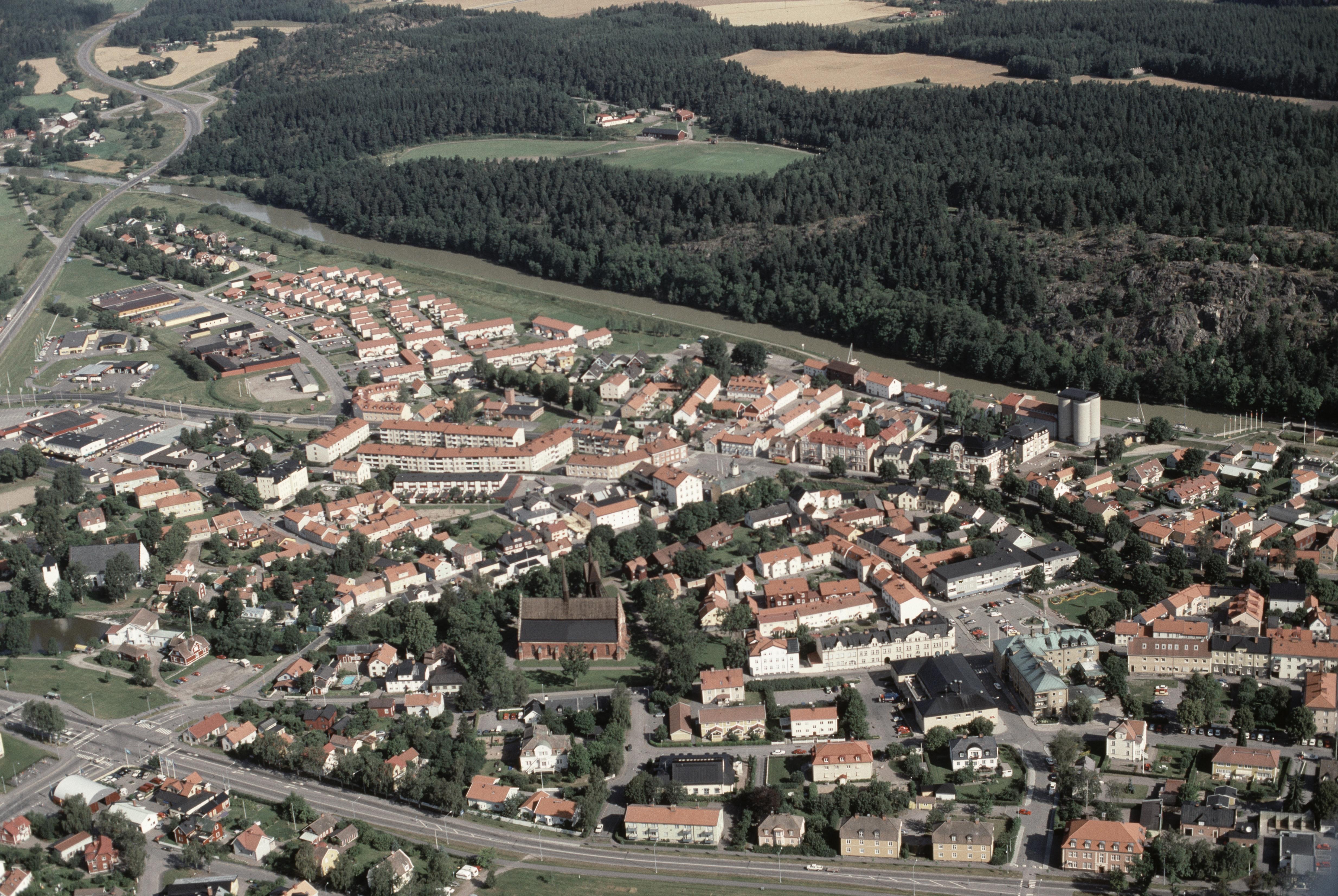 Storån i Söderköpings stad. Göta kanal och Ramunderberget i bildens övre del. Drothems kyrka i bildens vänstra kant. Sankt Laurentii kyrka till vänster under bildens mitt. Bilden är tagen mot (väderstreck): N
