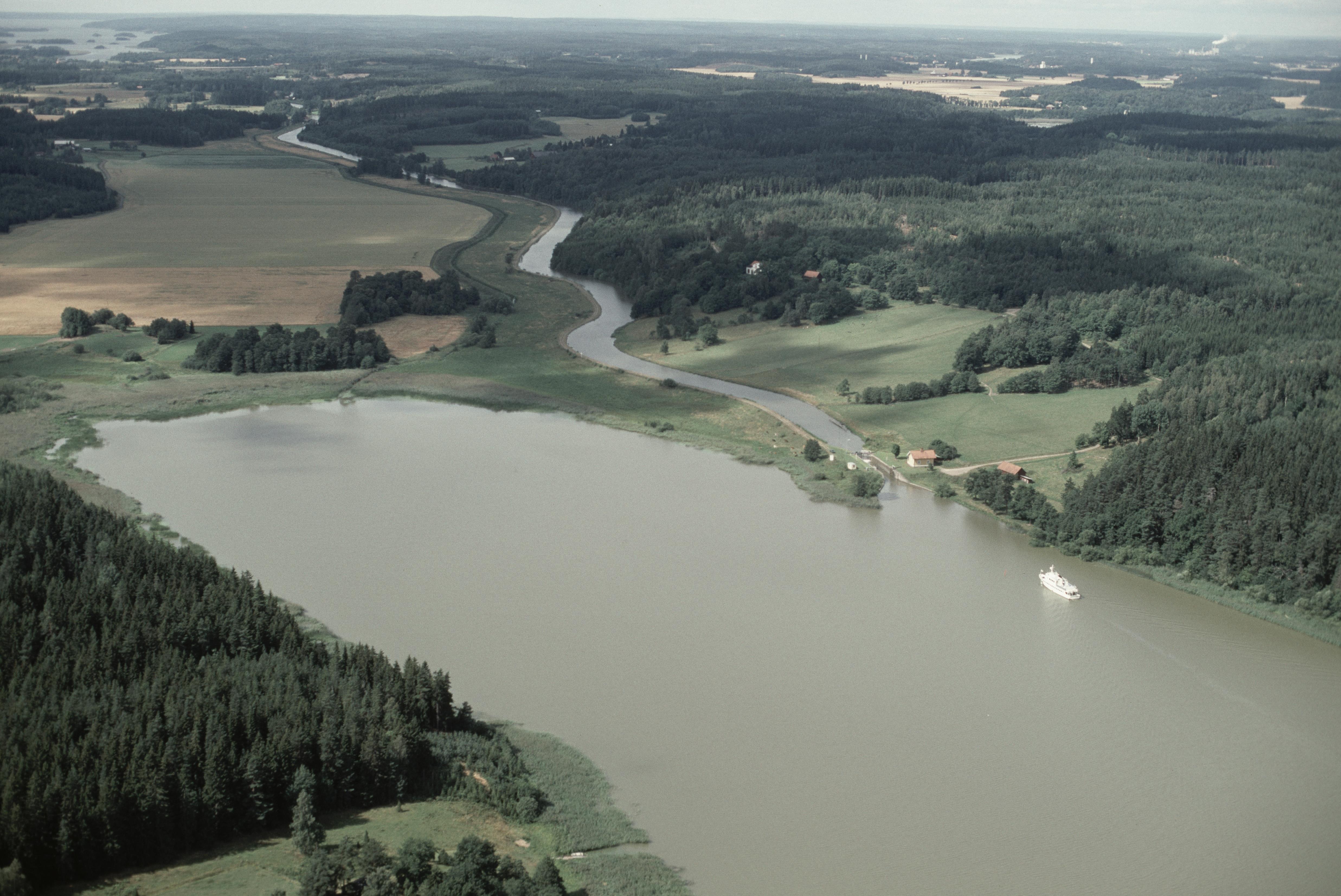 Göta kanal vid Hulta sluss och sjön Asplången. Vägmärke RAÄnr Kimstad 214:1 i bildens övre del. Socknet Skärkind i bildens vänstra kant och socknet Norrköping uppe till höger. Bilden är tagen mot (väderstreck): VNV