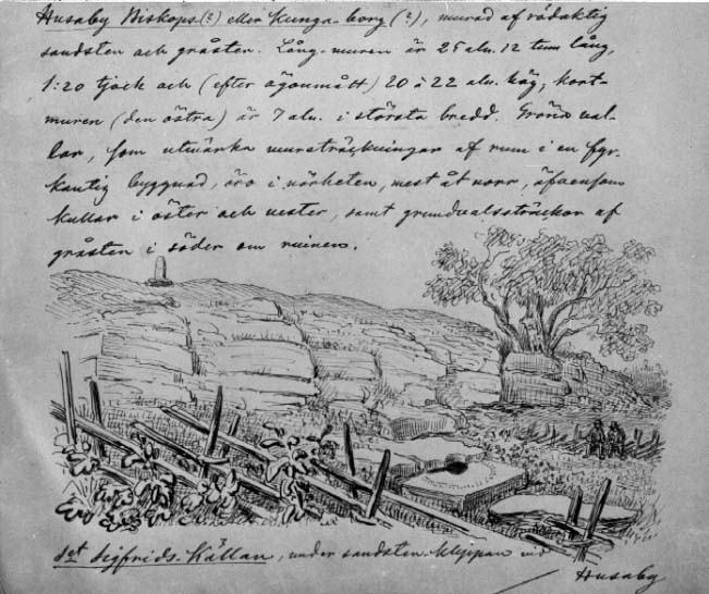"Käll-bordet", som 1836 blef nytt bekostadt af Klockaren Joh. Vidgren, vardt inom åtta dagar åter sönderslaget, Ock det hela är- ovärderligt nog- omgifvet af brännässlor och gamla nedruttna gärdes-gårdar,- Men på backen, vid stora landsvägen, står ett slags minnesmärke af gement modern art, ej olikt en vanlig mil-stolpe, som skall för landets folk säga, att der skedde det första dop till kristen tro och lära i Sverige. - Minnesmärket borde visserligen vara helt annorlunda och ett af ädlaste slag.