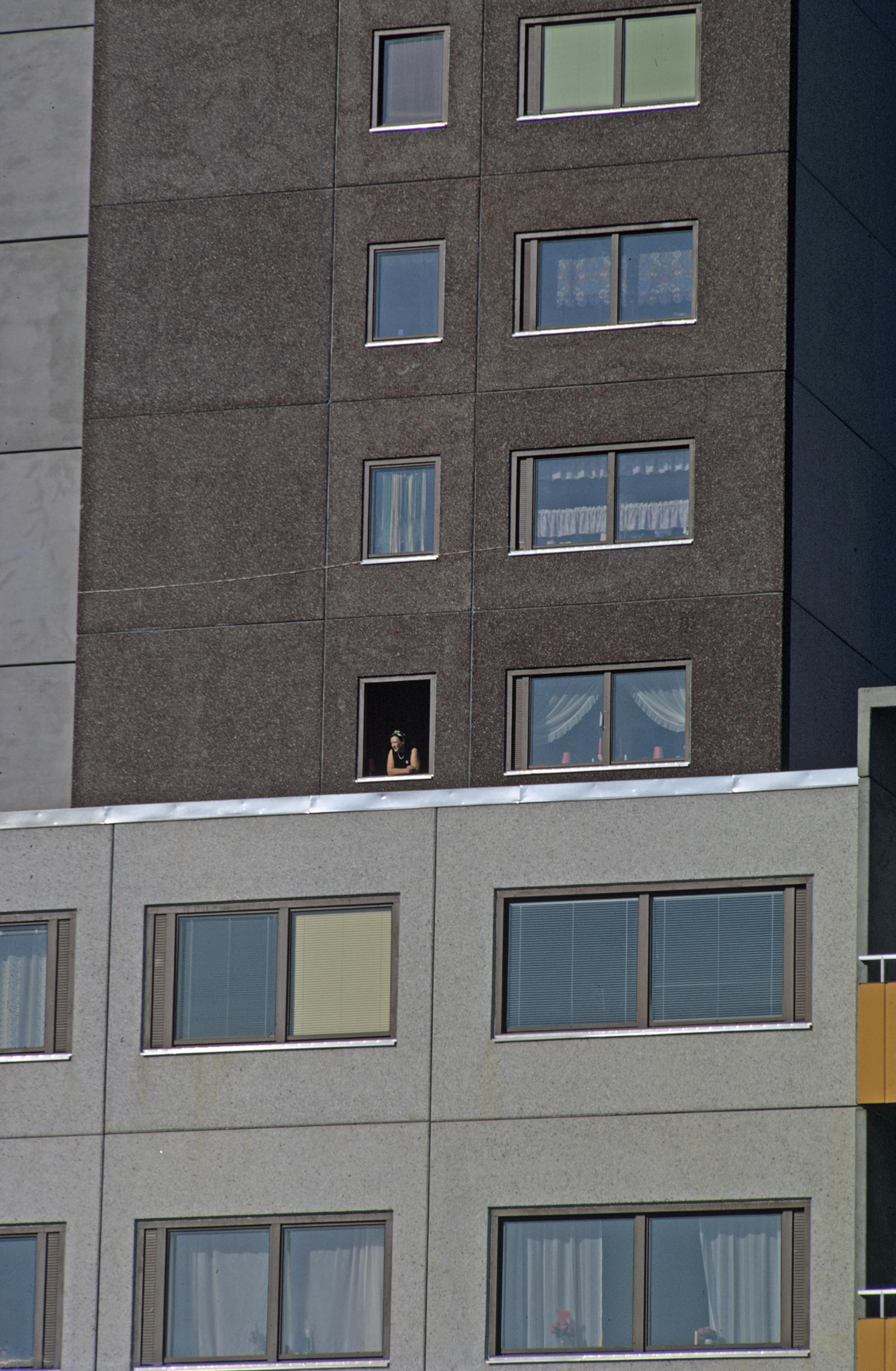 Lägenhetsfasad. Bilden troligen från början av 1970-talet.
