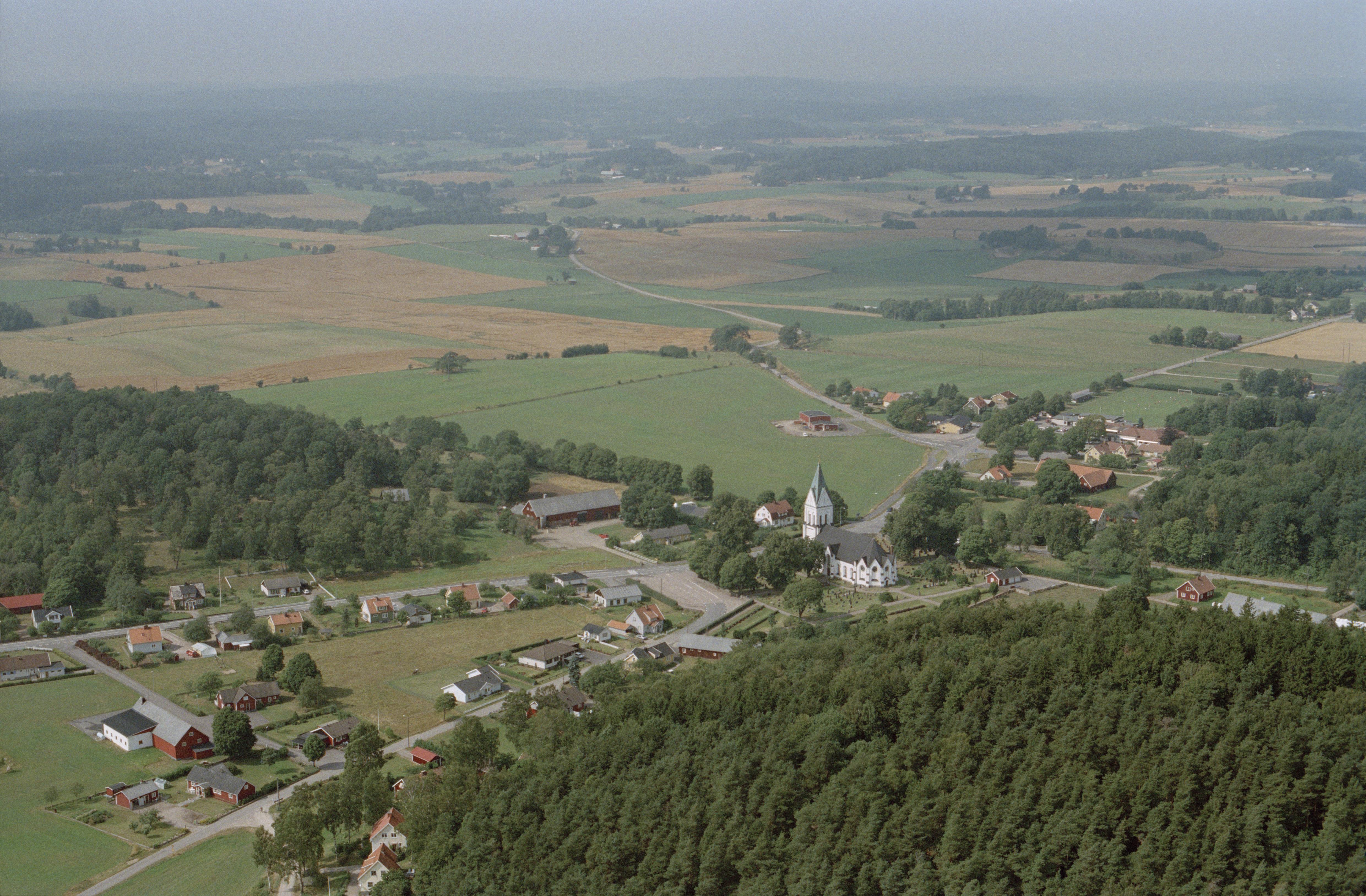 Okome kyrka och kyrkby i Ätradalen. Bilden är tagen mot (väderstreck): NV