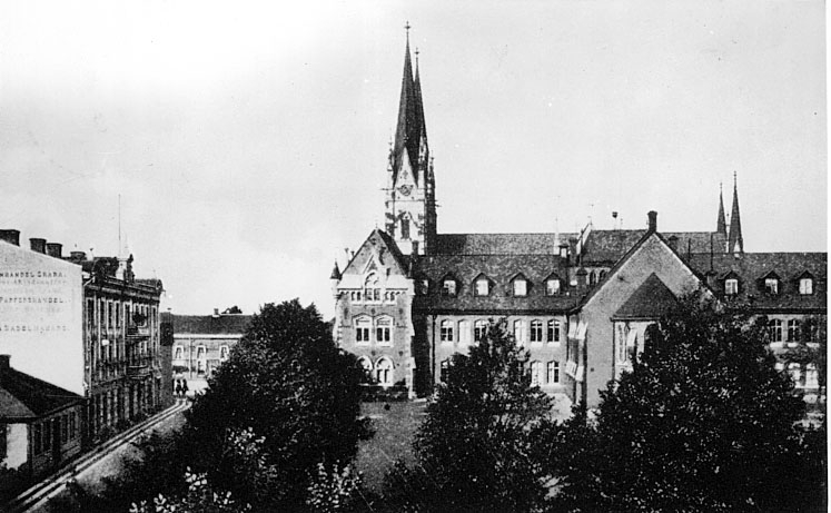 Skara, Järnvägsgatan, läroverket och domkyrkan.