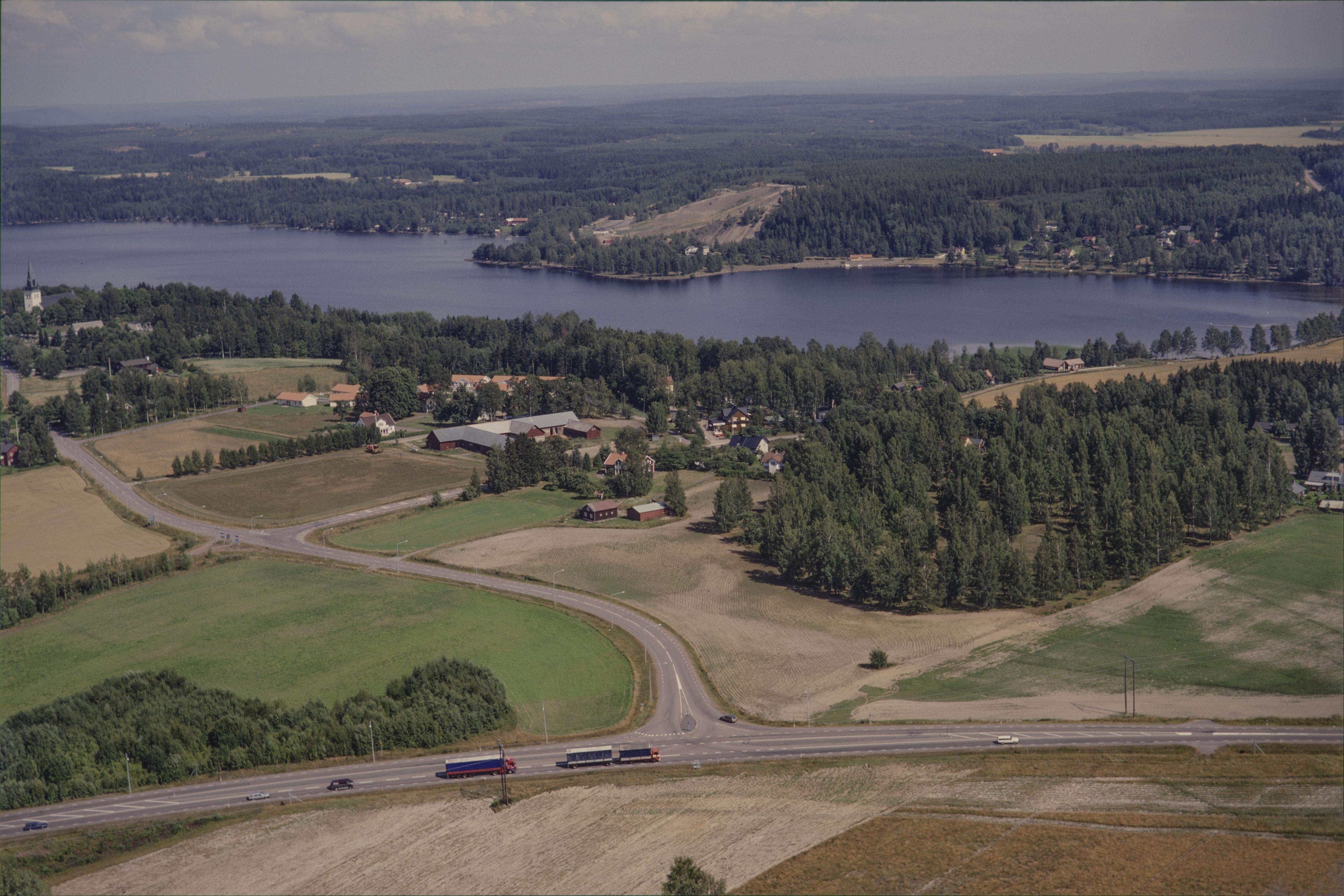 Gravfält RAÄnr Stora Kil 1:1-2 m.fl. vid Runnevål i norra delen av tätorten Kil. Uppe till vänster Stora Kils kyrka. I bildens övre del sjön Nedre Fryken. Bilden är tagen mot (väderstreck): NO