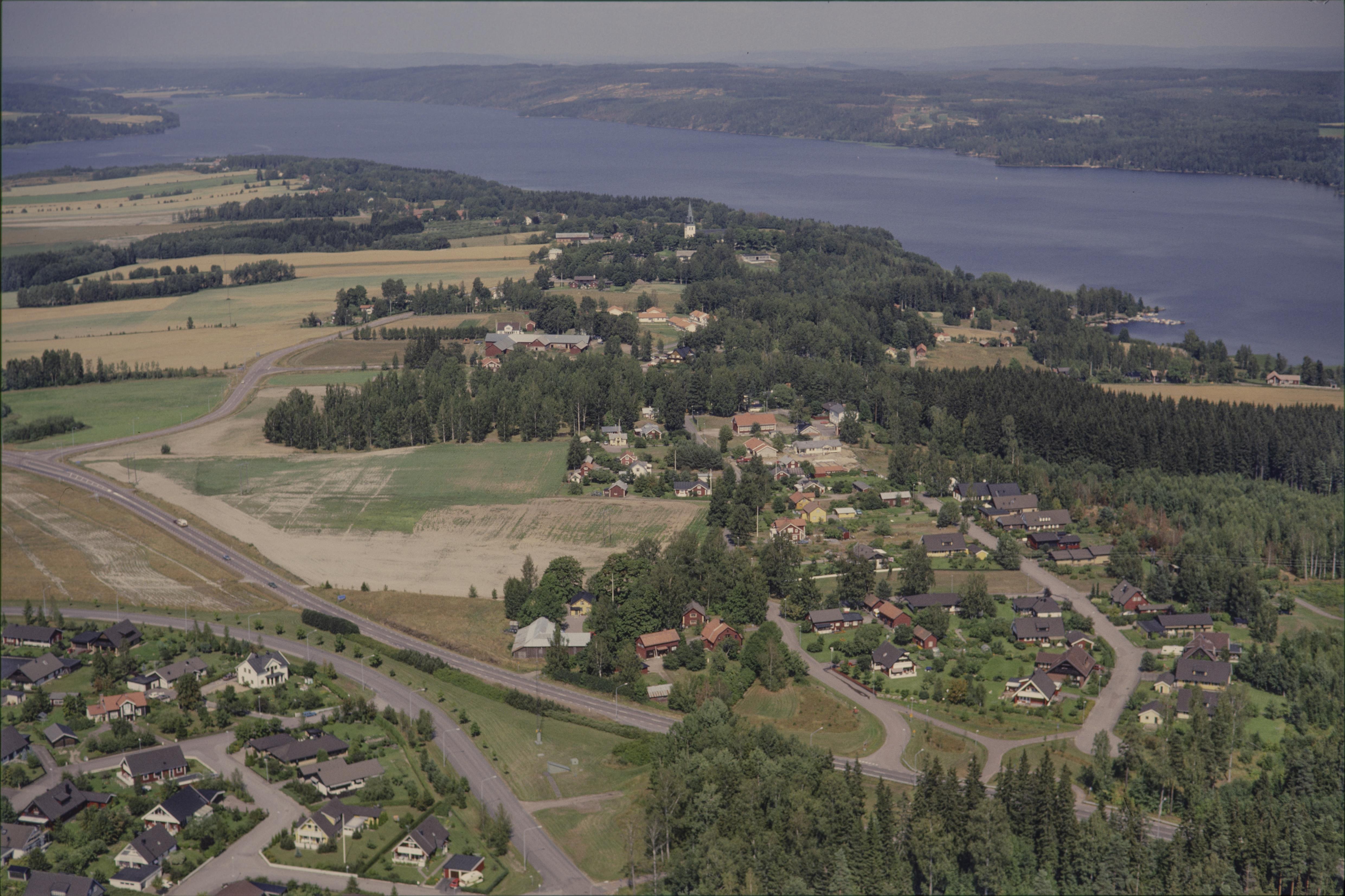 Gravfält RAÄnr Stora Kil 1:1-2 m.fl. vid Runnevål i norra delen av tätorten Kil. Uppe till vänster Stora Kils kyrka. I bildens övre del sjön Nedre Fryken. Bilden är tagen mot (väderstreck): NO