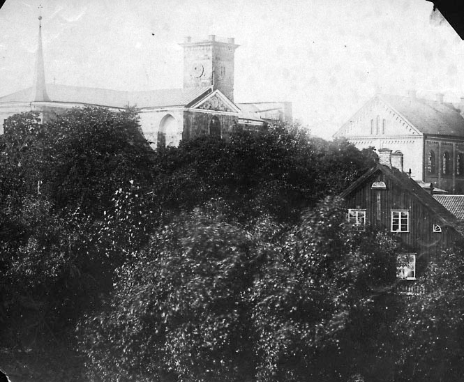 Titel: Skara, kv. Iris, foto mot sydväst, till höger Lancasterskolan och biblioteket.