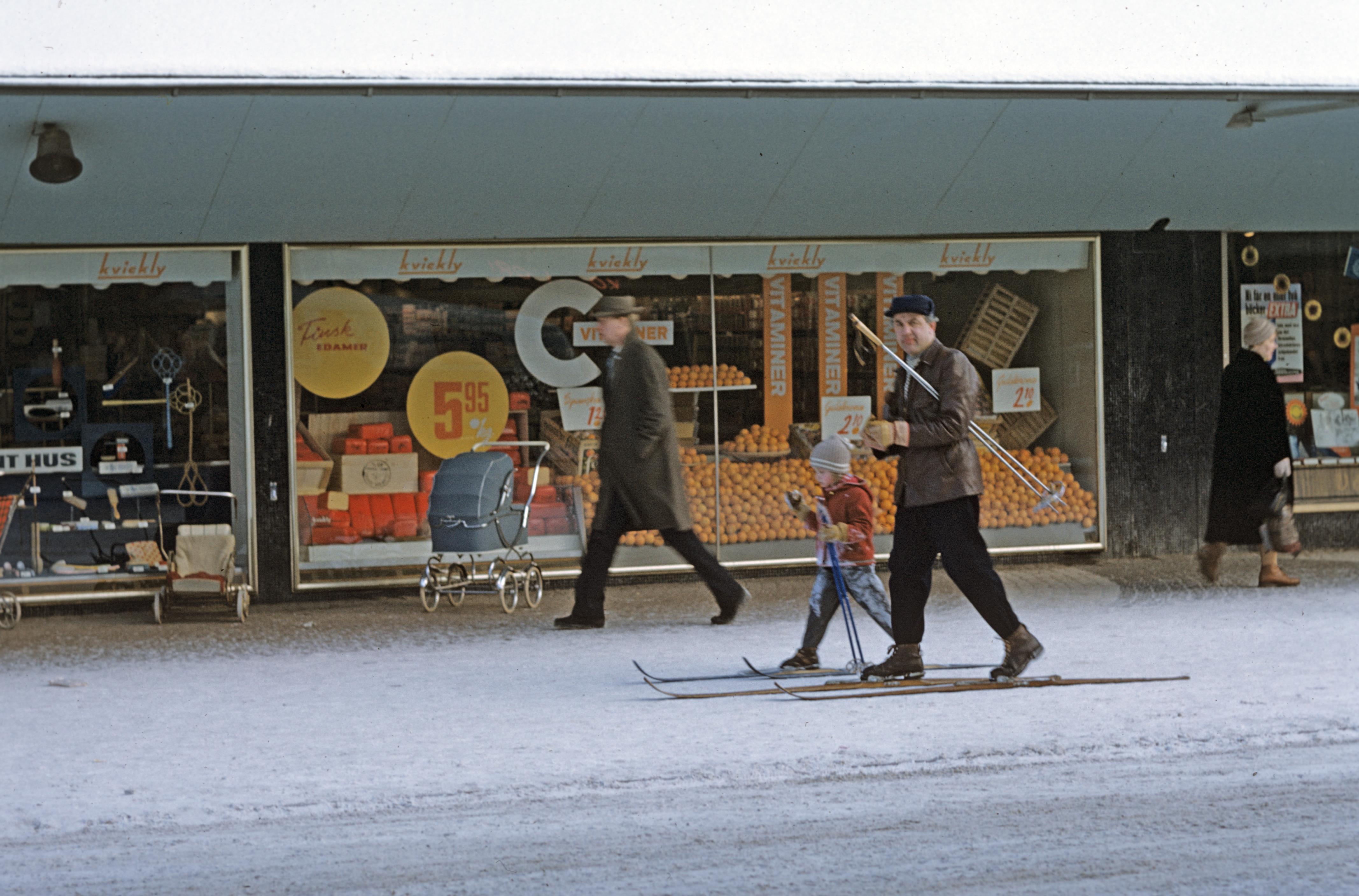 Längdskidåkning på torget. Bilden troligen från början av 1960-talet.