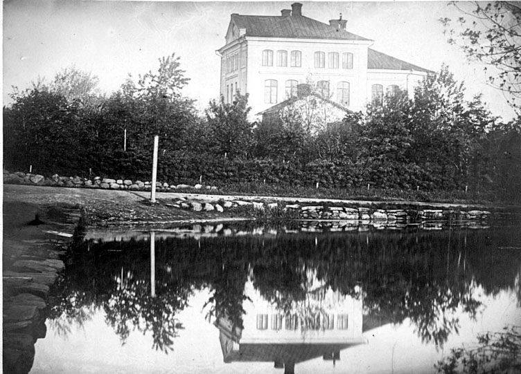 Skara, Seminarium avspeglat i Brogårdsdammen.