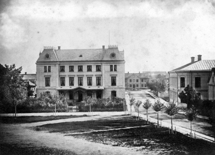 Från skolgården: Hotellet, Stationshuset, "kåken med rakstugan och sedemera telegrafen, Järnvägsatan.