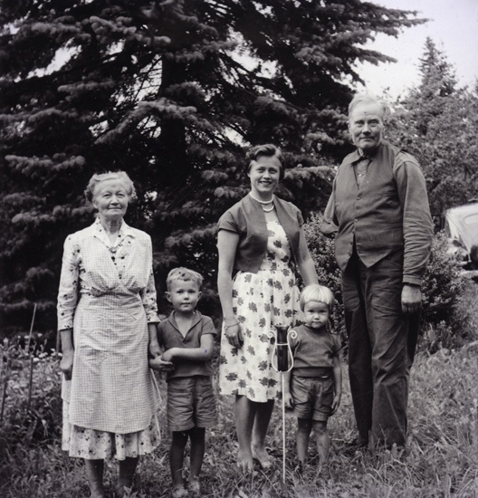 Hanna, Tekla och Ernst Biljer med Hannas barn, Heljesgården 25.11.1960.