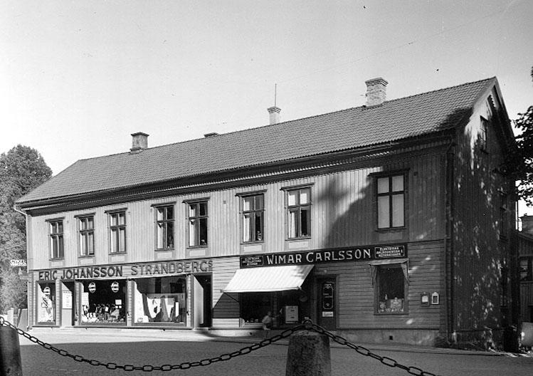 Från vänster är Eric Johansson:s cykelaffär med tillhörande reparationsverkstad, följd av Strandberg:s klädaffär och avslutas av Wimar Carlsson:s elaffär.