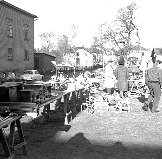 Titel: Skara. Lions club, loppmarknad på Lindmarks bakgård 10/5 1958.