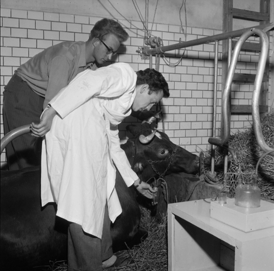 Ko-operation 1958. Veterinär Göran Jönsson (numera professor) behandlar ko med kalvförlamning.