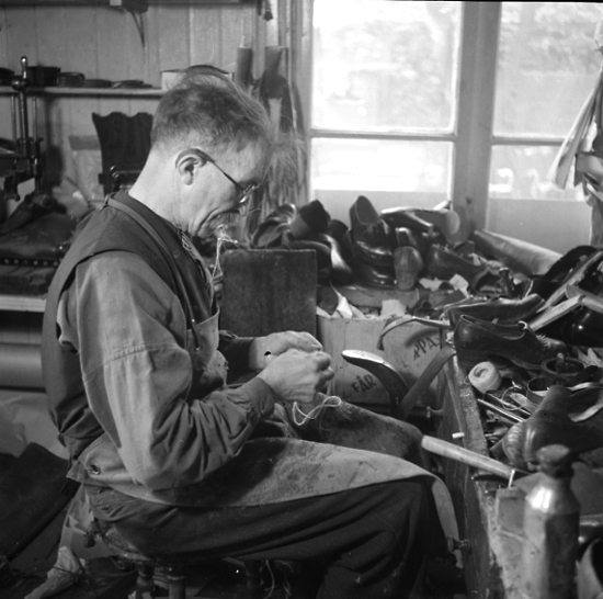 Skomakarmästare Ivar Spjut på sin verkstad, 1944.