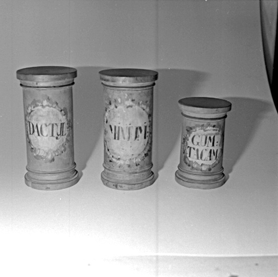 Skara. Veterinärinrättningen. Veterinärapotekets burkar.