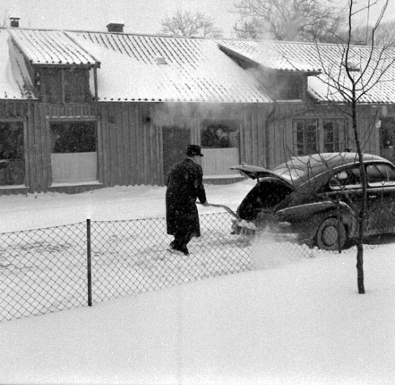 Pastor Nils Stenermark skottar fram sin PV på Qvänsels bakgård, vintern 1950.