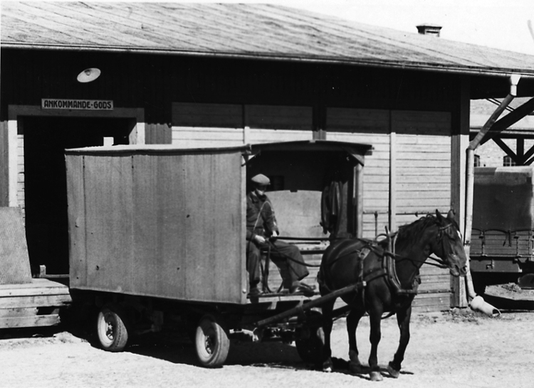 Erik Sahlström med sin häst "Dolly". Sahlström utförde under åren 1963-1972 transporter av gods såväl ankommande som avgående från trafikanter inom staden.