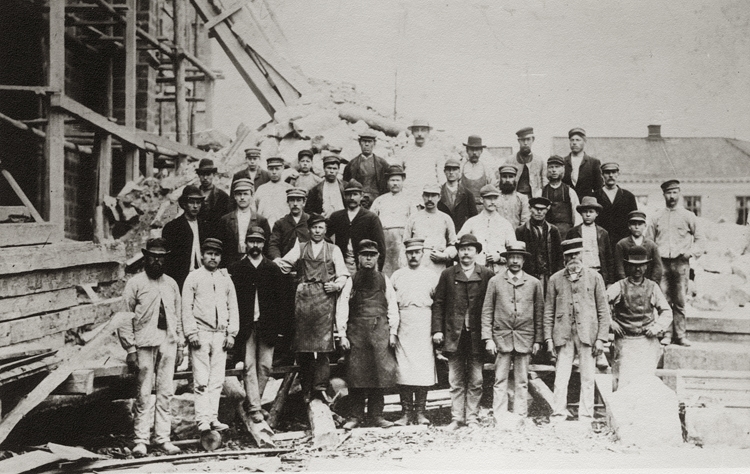 Byggarbetslag framför Skara domkyrka runt 1890.