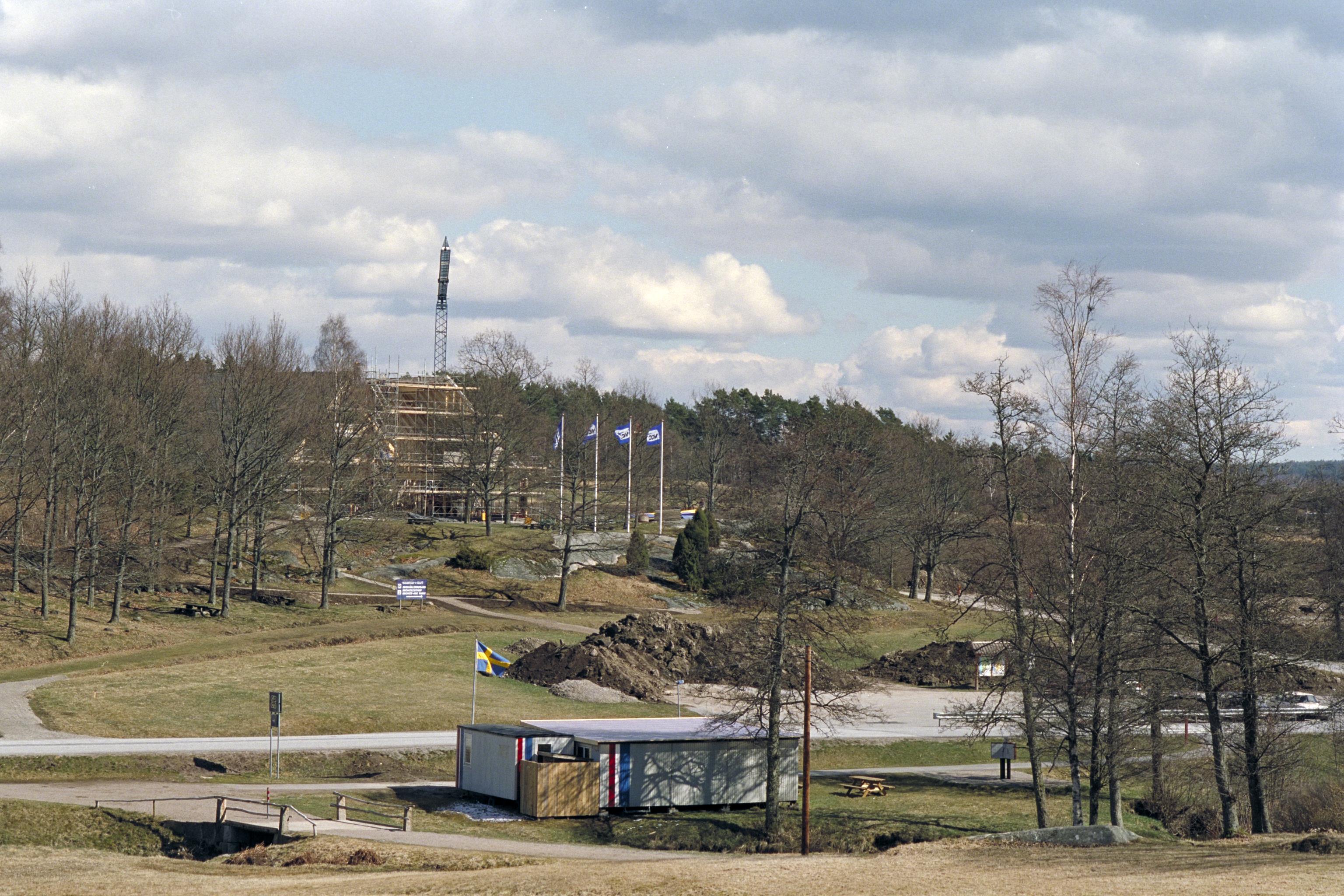 Vy från Vitlyckeristningen mot byggandet av det nya hällristningsmuseet i Tanum, färdigt 1998.