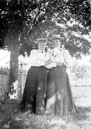 Wilhelmina Pettersson t. h. Daretorps gamla missionshus i bakgrunden, 1870-talet.