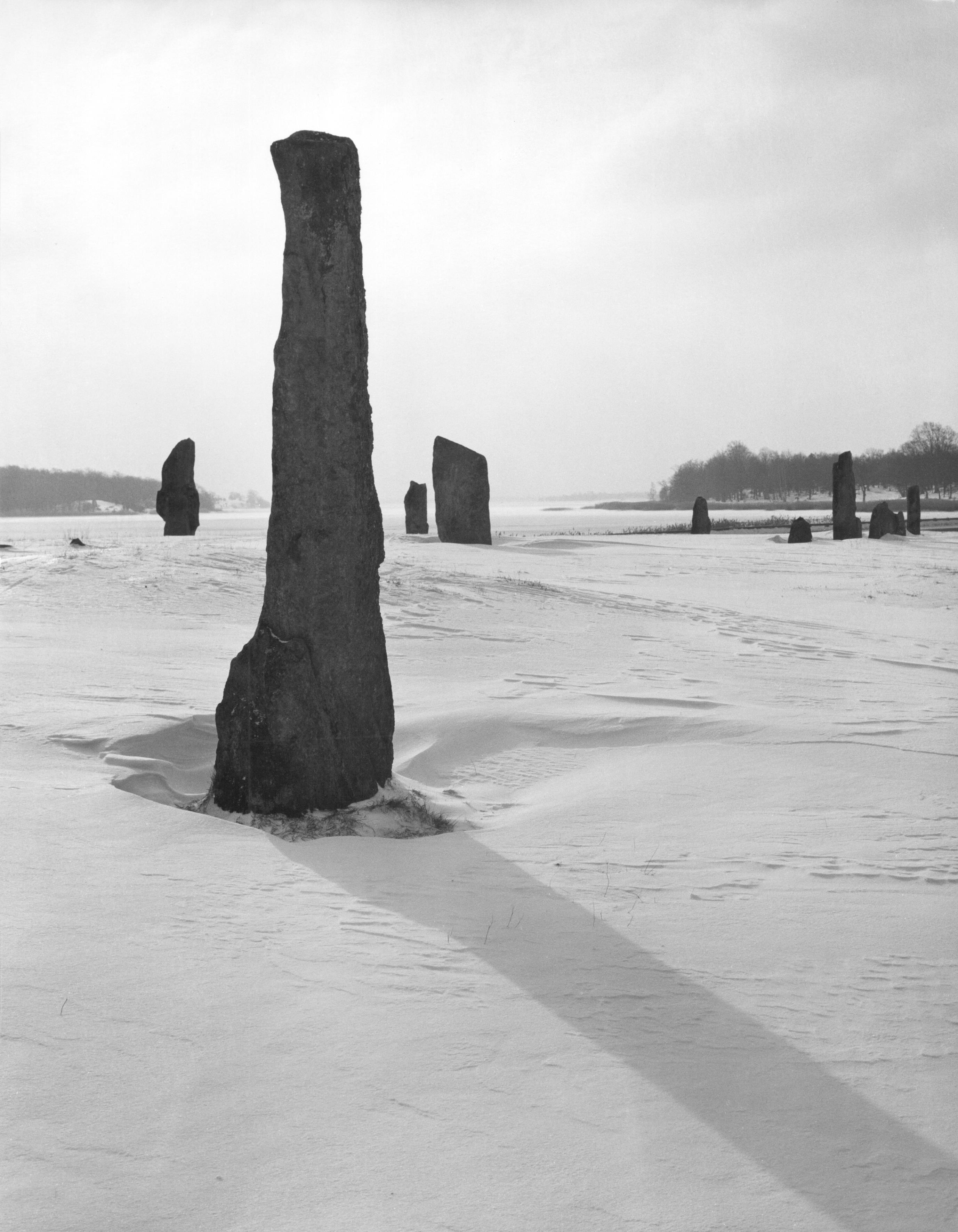 RAÄ-nummer Förkärla 12:1. Gravfält, bestående av 110 fornlämningar, vilka utgörs av stensättningar, skeppssättningar, treuddar, stenrader och resta stenar. Bilden troligen från omkring 1970.