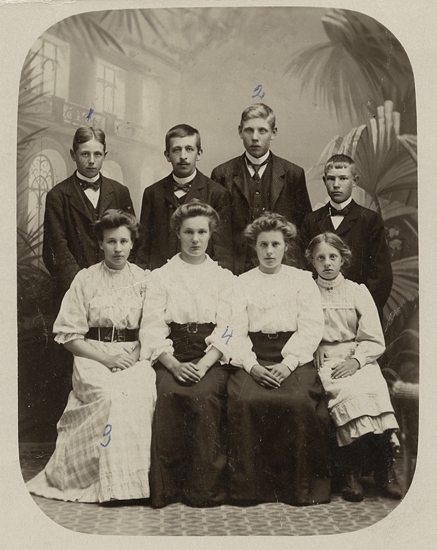 Flickan i främre rade längst till vänster är Karolina Josefina, gift Karlsson 1888-1973.