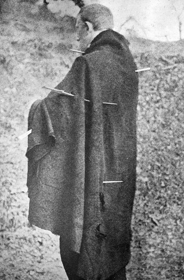 "Pinnarna" som sitter i manteln visar var dolkhuggen gått igenom tyget och träffat den som burit manteln.