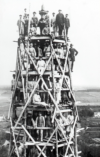 Många arbetare på byggnadsställningar på Skara Domkyrkas norra torn i samband med restaureringen 1891.