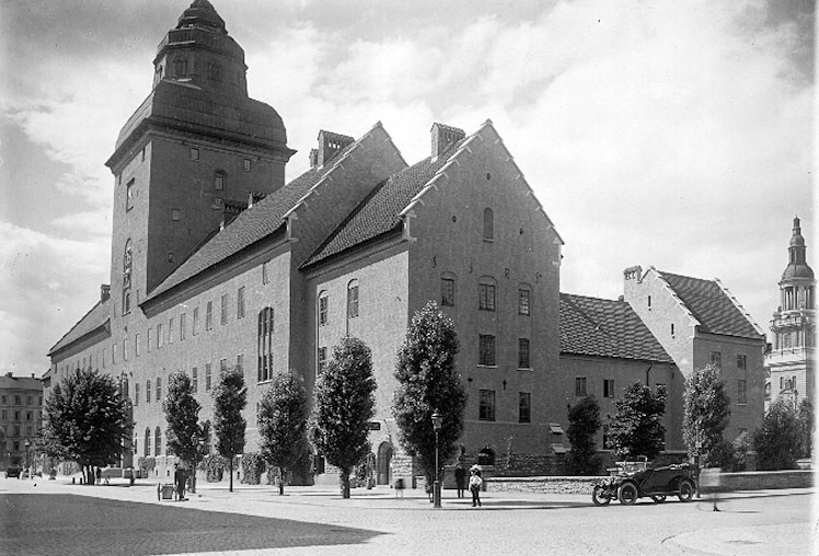 2000-08-14, AS. Stockholms rådhus. (uppfört 1911-1915) ritades av arkitekten Carl Westman, 1866-1936. Byggnaden är med sin tunga huvudfasad av gråslammat rött tegel, sin kärva enkla hållning och sitt mäktiga torn inpirerat av Vadstena slott, också interiört har Westman anknutit till äldre svensk arkitektur.