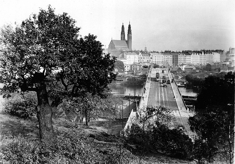 I förgrunden har vi Liljeholmsbron och i bakgrunden Högalidskyrkan, som ligger i stadsdelen Södermalm.