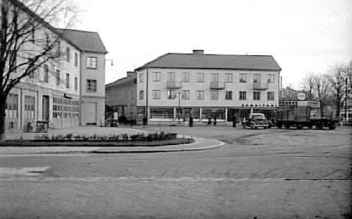 VY ÖVER SANDTORGET MED BRANDSTATIONEN TILL VÄNSTER. FOTO MOT ÖSTER.