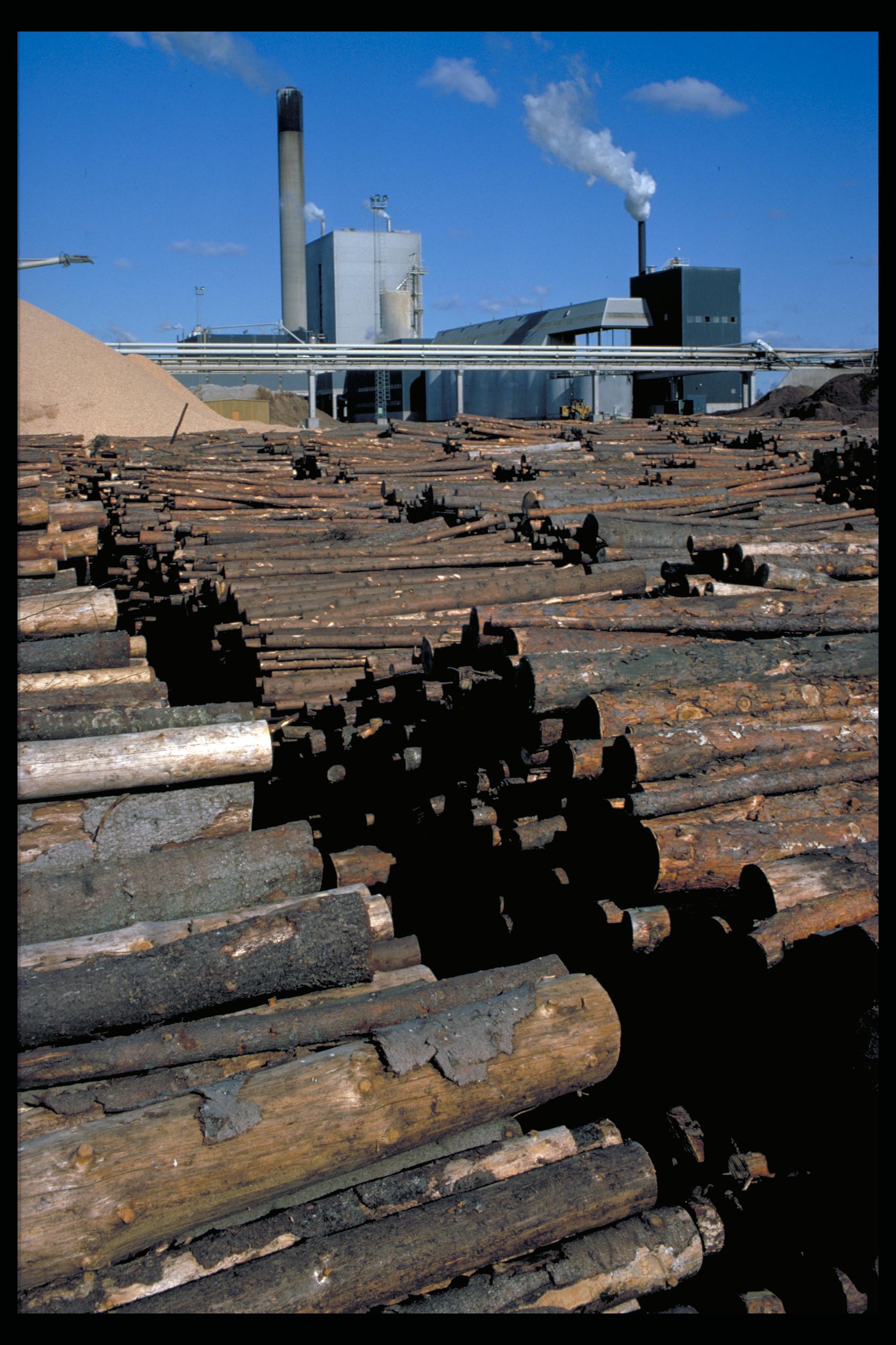 Massafabrikens virkes- och flislager. Bilden troligen från mitten av 1970-talet.