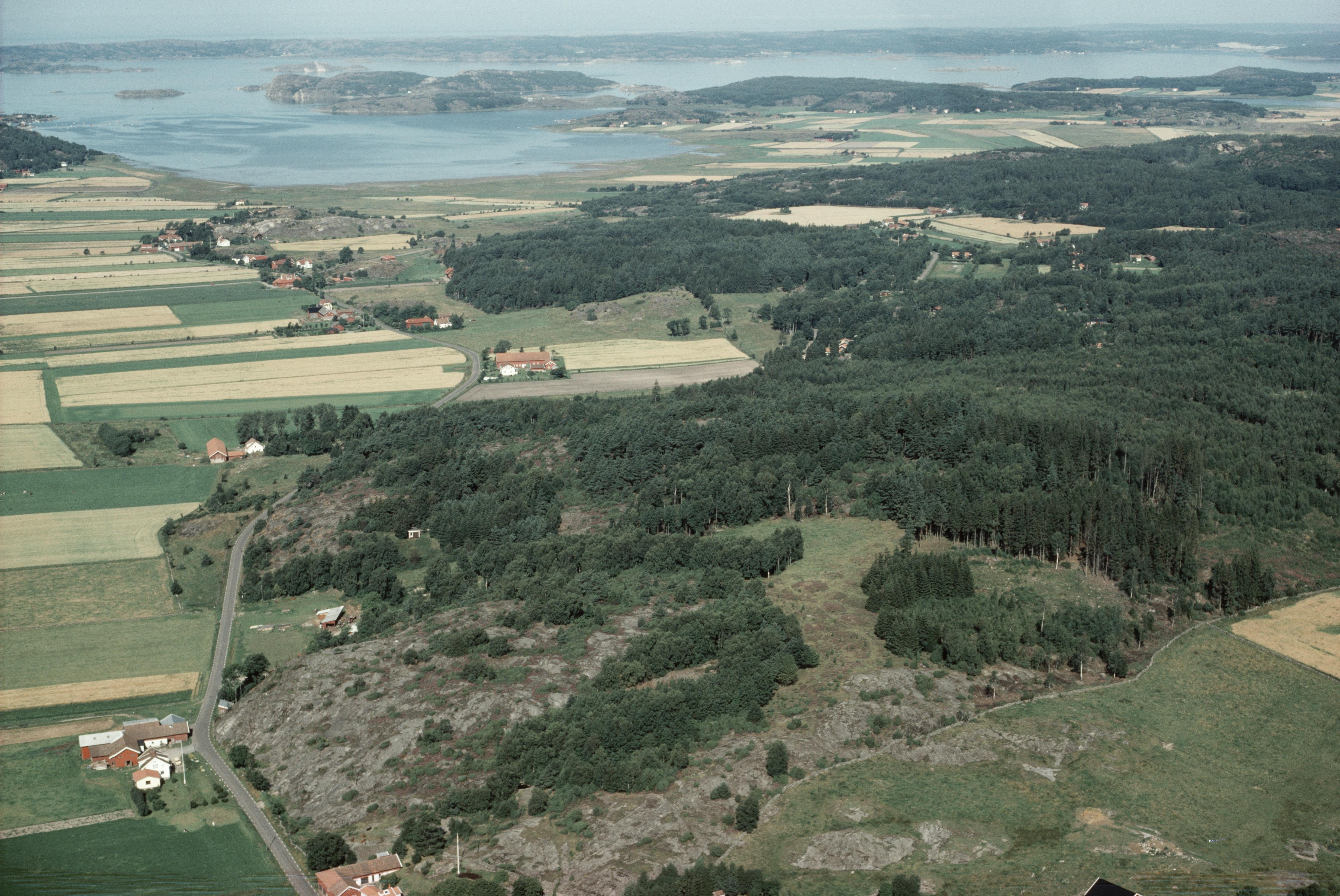 Grannebyåns dalgång mot Solberga socken och havsviken Ödsmåls kile. Gravfält RAÄnr Hålta 12:1 m.fl. nere till höger. Bilden är tagen mot (väderstreck): NV