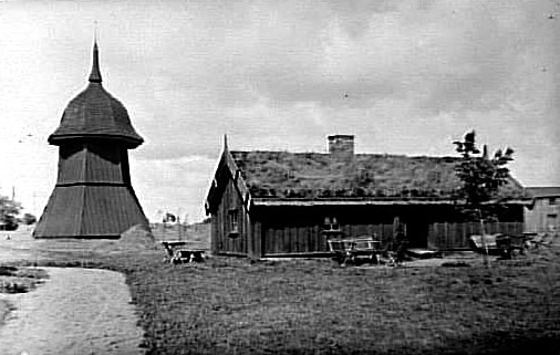 Kärråkrastapeln och Höjentorpsstugan i Fornbyn, Skara.