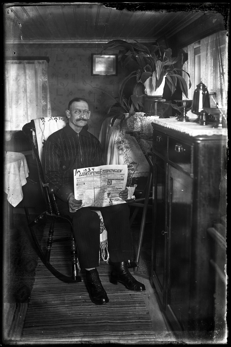 Man i gungstol med Lidköpingstidning