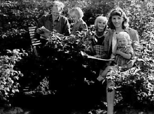 NÅGRA BARN OCH VUXNA SOM SITTER I TRÄDGÅRDEN