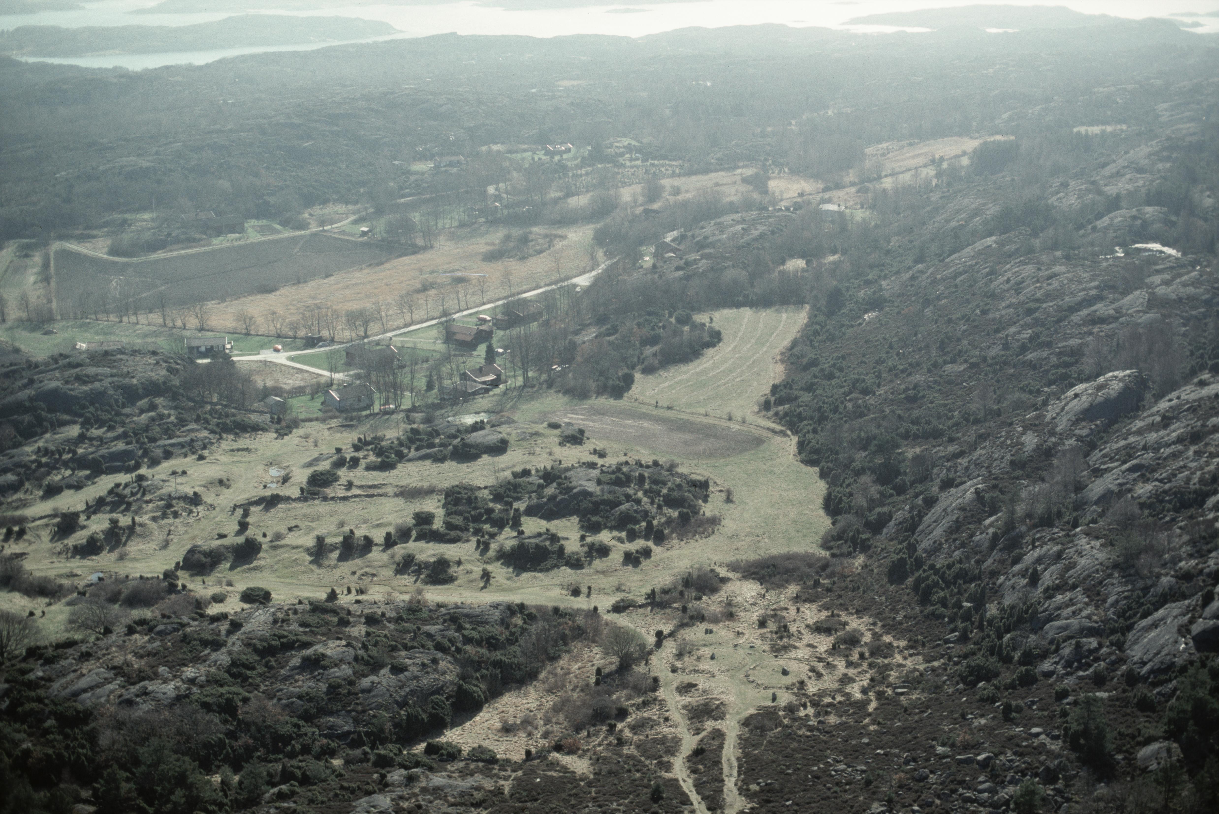 Gravfält Pilane RAÄnr Klövedal 105:1. Daterat till järnåldern och består av ett 90-tal fornlämningar, bl.a. högar, resta stenar, stensättningar och domarringar. Bilden är tagen mot (väderstreck): SV