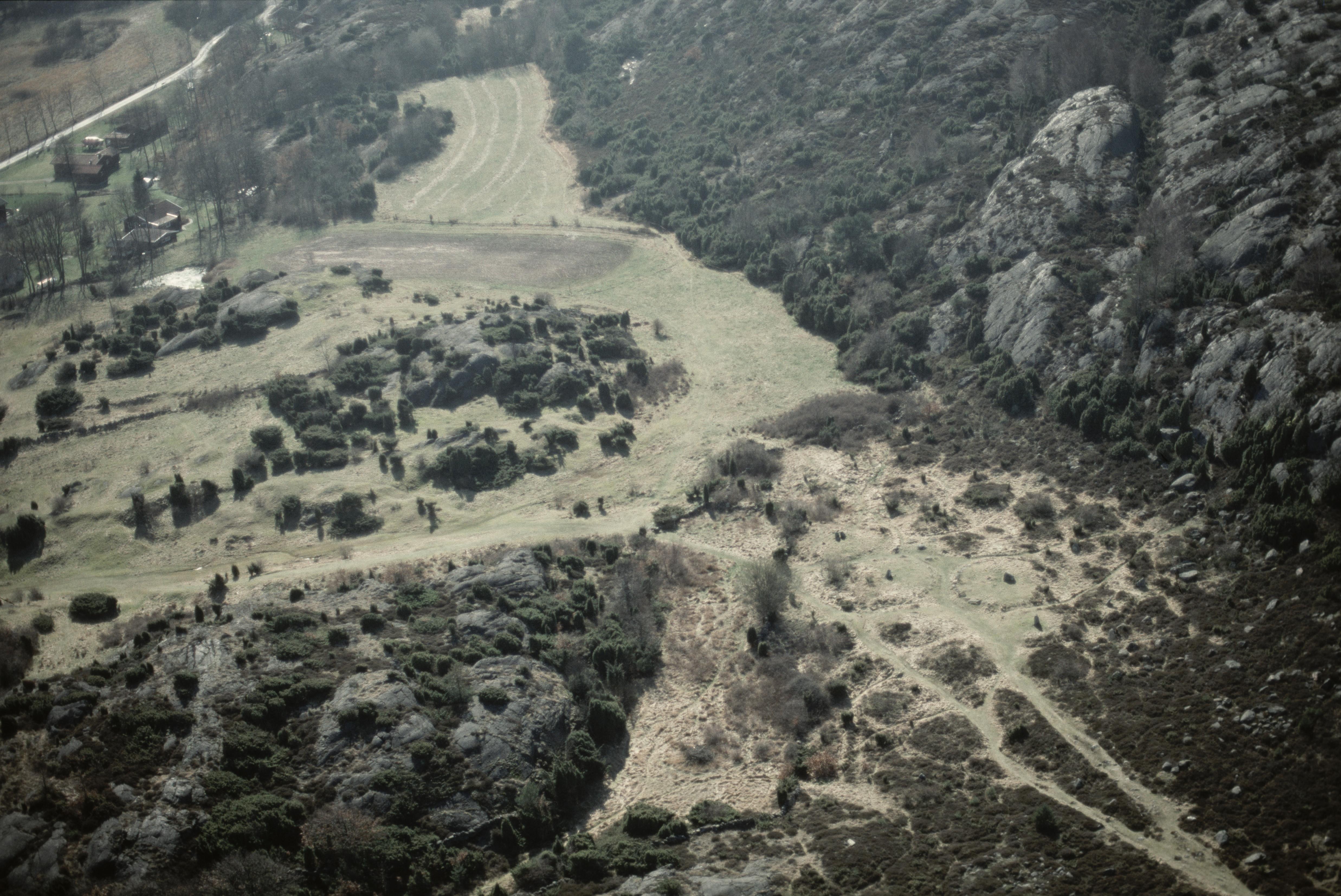 Gravfält Pilane RAÄnr Klövedal 105:1. Daterat till järnåldern och består av ett 90-tal fornlämningar, bl.a. högar, resta stenar, stensättningar och domarringar. Bilden är tagen mot (väderstreck): SSV